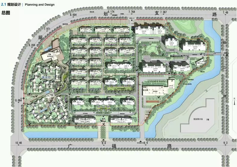 其中1-3#、8-11#、13#、15-17#、21#、22#、28#、29#、31#、32#楼为3层高的别墅;5#、6#楼为18层,7#、46#楼为17层,45#楼为16层;23#、33#、37#楼为6层,39#、40#、43#楼为9层;19#、20#、30#、36#、38#楼为3层的合院。