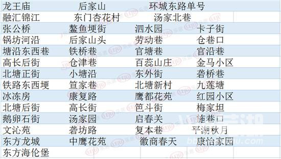 长江路双70-106号 长江路单61-95号 王家巷铁路 王家巷 长盛园 杏园小区 枣园小区 桃园小区 梅园小区 兰苑新村 花园路 花园新村 龙桥行政村 泰华家园 胜利西路 胜利东路 袁屋基 宋家山 九中宿舍 福达花园 橡胶厂宿舍 龙桥路 龙昌花园 孙家村 新芜区廉租安置小区 在水一方小区 长江湾