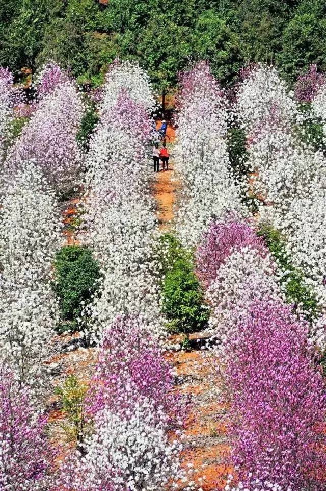 粉色、紫色、白色的玉兰花交错盛开着,呈上一场视觉的盛宴!
