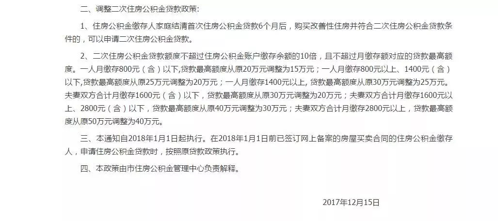 一人月缴存800元(含)以下,贷款最高额度从原20万元调整为15万元;一人月缴存800元以上、1400元(含)以下,贷款最高额度从原25万元调整为20万元;一人月缴存1400元以上, 贷款最高额度从原30万元调整为25万元。