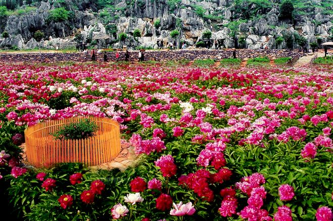 2、景区是着名的“牡丹之乡”,每当清明前后,一片片、一簇簇的牡丹花开放在妙石之间,石与花相映成趣,美不胜收。