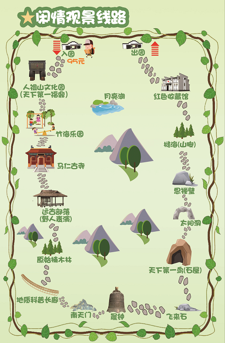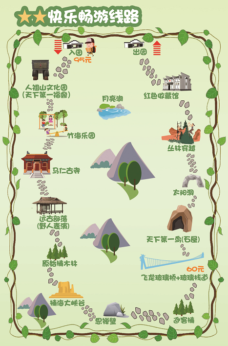 主要项目:飞龙玻璃桥+天梯玻璃栈道、人祖山文化园(天下第一福鼎)、远古部落(野人表演)、楠海大峡谷、天下第一鸟(石屋)、红色收藏馆。