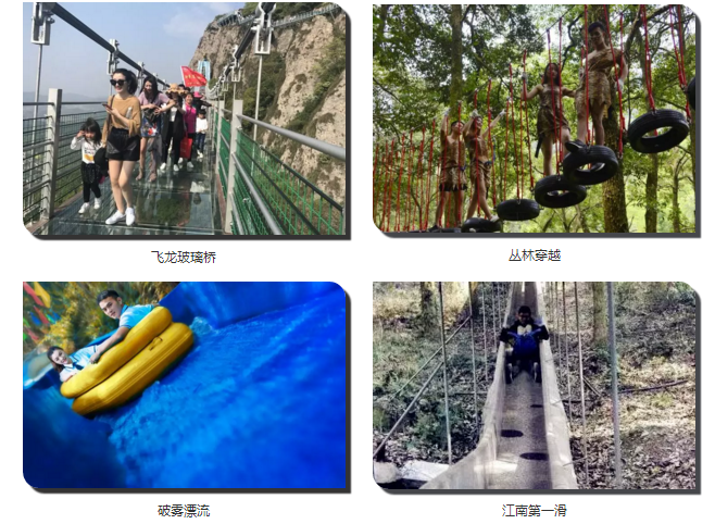 主要项目:飞龙玻璃桥+天梯玻璃栈道、江南第一滑、破雾漂流、丛林穿越、远古部落(野人表演)、天下第一鸟(石屋)、马仁古寺、人祖山文化园(天下第一福鼎)、红色收藏馆。