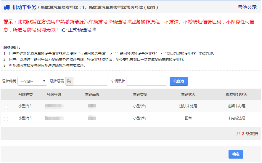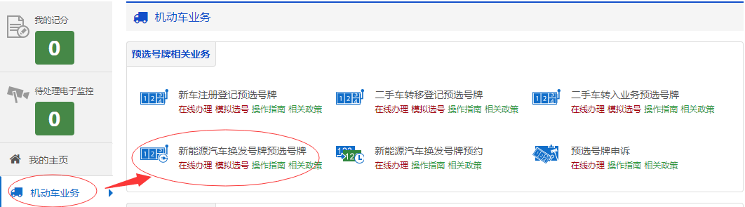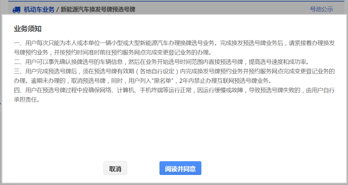 用户通过该功能可以为自己或单位名下的新能源汽车换牌预选号牌(详情请阅读新能源汽车换牌选号业务须知)。