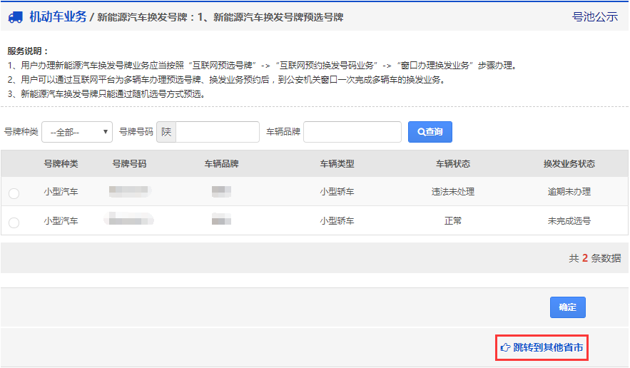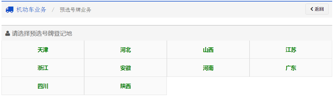 异地预选号牌: 针对新车车主、单位用户,只能在用户注册地办理预选机动车号牌业务。对于车主/驾驶人用户、窗口注册用户,登录互联网服务平台后,可以通过正式选号中的“跳转到其他省市”链接进入异地预选号牌跳转页面。 如下图所示: