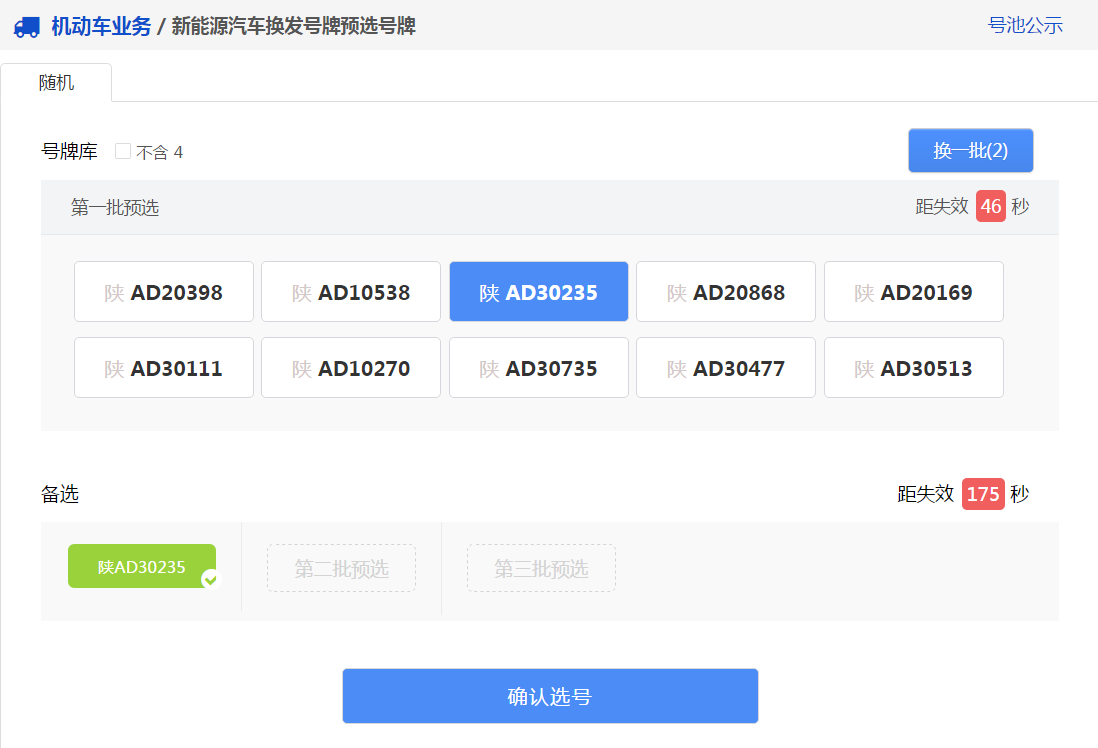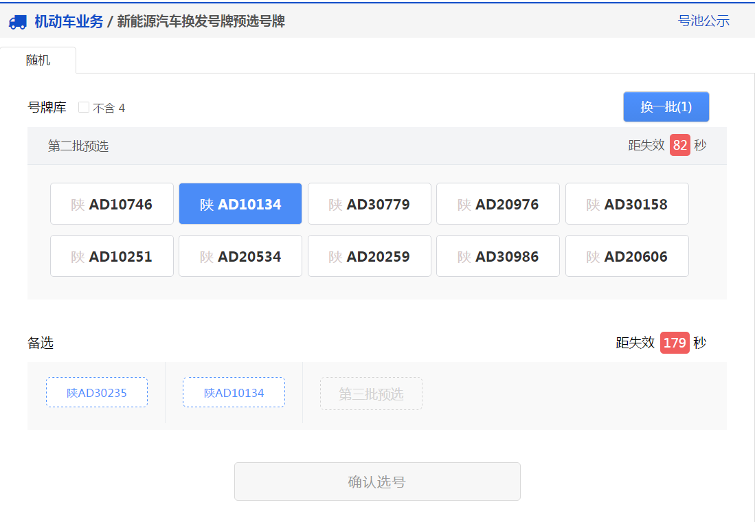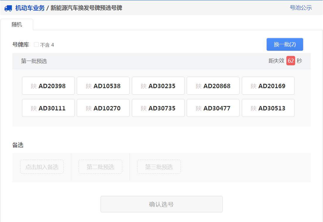 用户可以点击右上角“换一批”按钮重新进行随机(“换一批”后面的括号中的数字为用户当前选号车辆的剩余随机选号次数),此时会更新随机号牌栏中的号牌。如果备选号牌栏中的有号牌并且没有失效,则备选栏中的倒计时将重新开始倒计时。用户可以在新随机的号牌号码中选择一个号牌号码作为备选号牌,此时备选栏中的倒计时也将重新开始倒计时。如下图所示。如此循环操作,用户每次随机选号,都可以从随机号牌中选择一个号牌号码作为备选号牌,直到随机选号次数用完。