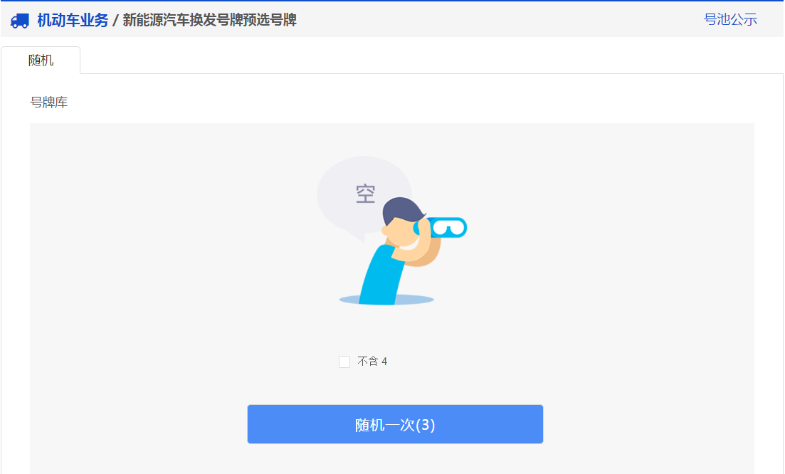 第二阶段--步骤2:【预选号牌】返回换发新能源汽车号牌预选号牌业务只提供随机选号方式,如下图所示。
