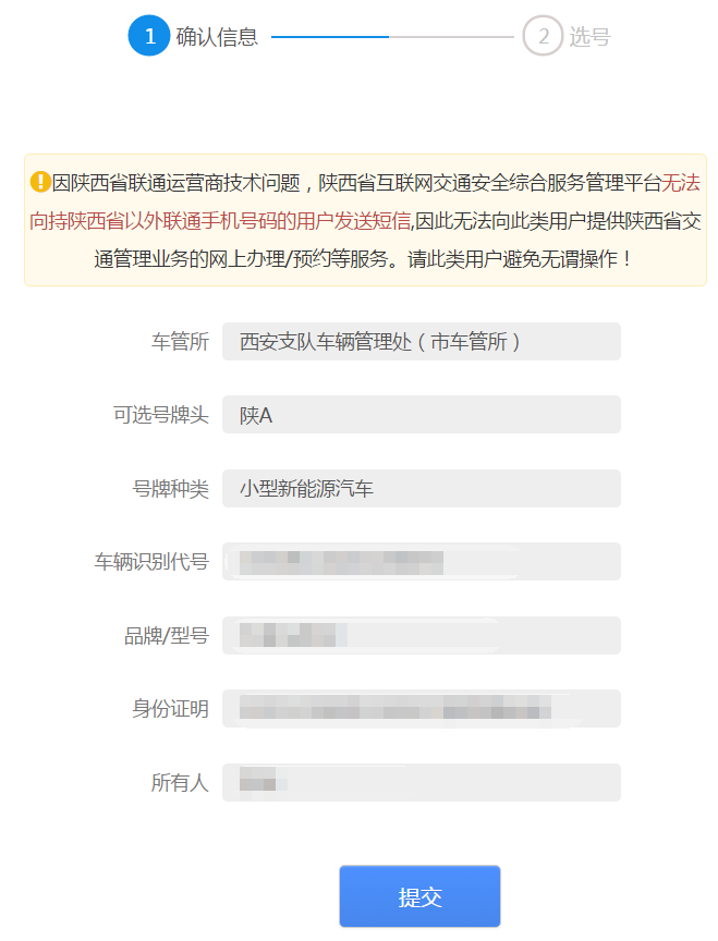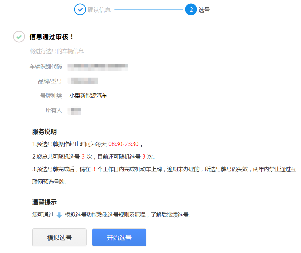 第一阶段:步骤3:【选号服务说明】返回用户可以看到之前选择提交车辆的信息,如下图所示。
