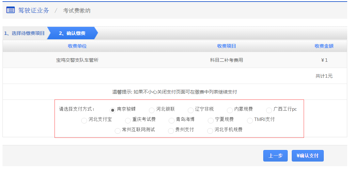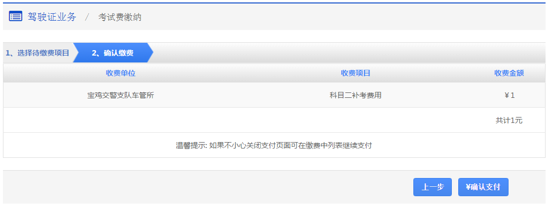步骤1:【选择待缴费项目(待缴费项目)】在该步骤,会显示用户需要缴纳的考试费列表,用户需选择待缴费的项目,点击【下一步】进入步骤2【确认缴费】。 注意事项: