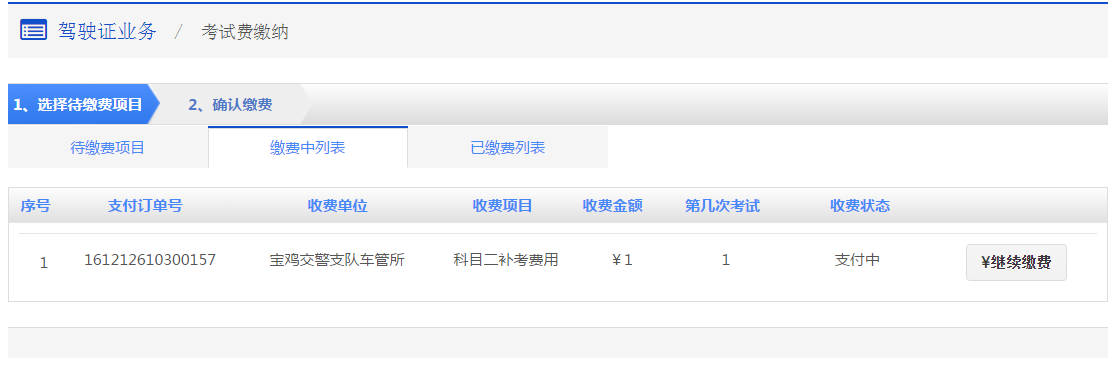 继续缴费 步骤1:【选择待缴费项目(缴费中项目)】在该步骤,会显示用户正在缴纳中的考试费列表,点击列表后的【继续缴费】按钮,进入步骤2继续缴费【确认缴费】。