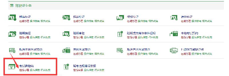 首先进入登陆:安徽交通综合服务平台 如下图找到驾驶证业务→考试费缴纳(在线办理)