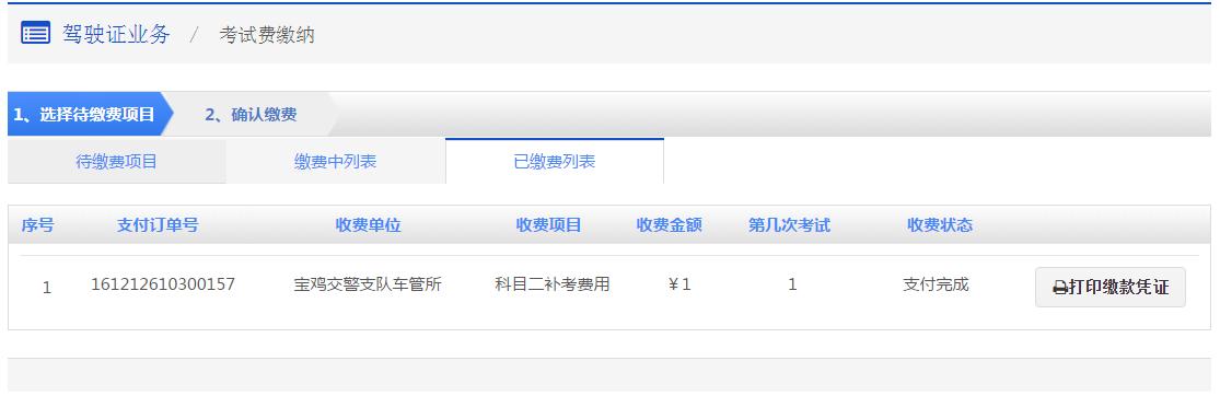 打印缴费凭证 步骤1:【选择待缴费项目(缴费中项目)】在该步骤,会显示后台确认缴费成功的项目,点击列表后的【打印缴费凭证】按钮,进入步骤2【打印缴费凭证】。