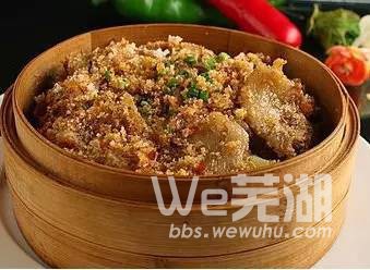 渣肉蒸饭,以糯米为饭,猪肉切开用调味料腌渍后蘸上渣粉,放糯米饭上蒸熟而成。是一种味美香咸,有饭有菜,经济实惠的小吃。