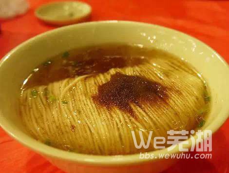 “耿福兴虾籽面”有着近90年历史,是芜湖着名小吃佳品。凡到芜湖的人,都要慕名而至,以亲口品尝为快。虾籽面采取宽汤窄面之法,将面条煮沸后略加冷水煮上片刻,捞起兑入有虾籽、猪油、葱花、酱油等佐料的高汤,入口鲜美无比,是《舌尖上的中国2》中的推荐美食。