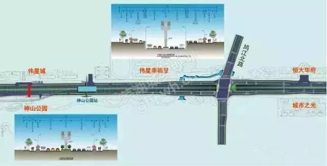 由于赤铸山路的快速化改造对两侧地块的割裂效应,结合轨道交通的站台考虑人行过街方案,在伟星城大门东侧、万科城大门西侧、东方红郡大门三处增设人行过街地道。