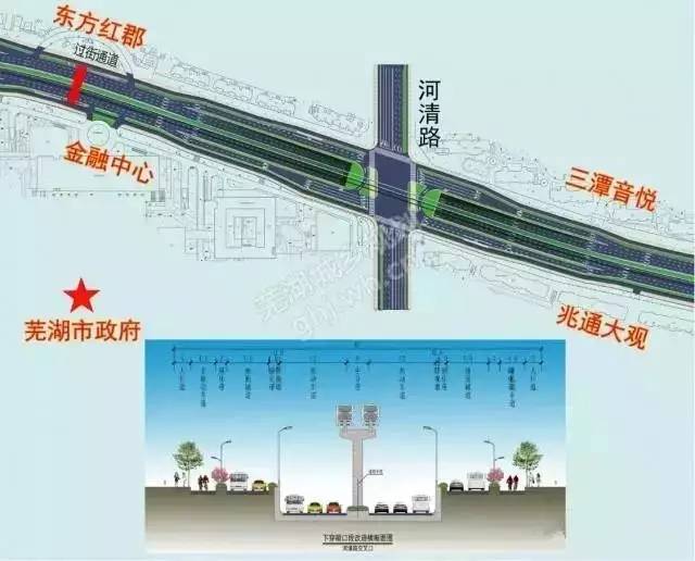 赤铸山路以双向六车道规模下穿鸠江北路、中江大道、河清路和安澜路,云从路、海晏路右进右出,徽州路节点改造为徽州路以双向六车道规模下穿赤铸山路、赤铸山路由西向北以左转匝道型式连接至徽州路。