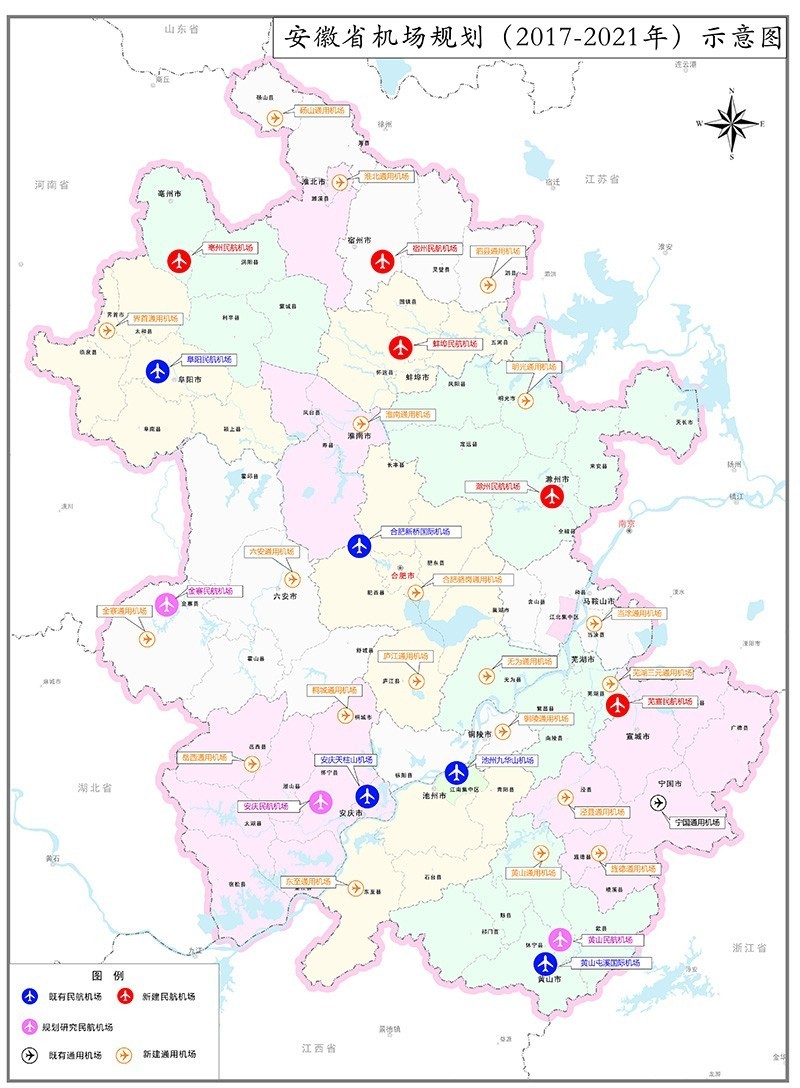 在通用机场建设方面,规划明确提出推进合肥骆岗、庐江、黄山、泾县、泗县、岳西、无为等通用机场项目前期工作。从《安徽省机场规划(2017~2021年)示意图》中可看出,已明确标注无为通用机场。