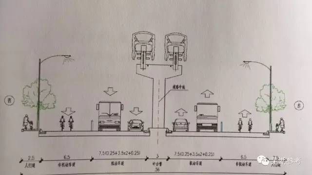 本道路无中分带,桥墩处需新建中央绿化带,本段道路改造考虑设置3m的中分带,将两侧侧分带硬化为车行道,并将水泥混凝土路面改造为沥青路面,人行道不变。