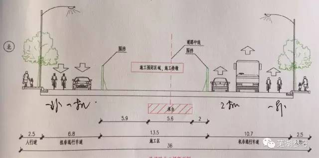 按照《芜湖市轨道交通施工期间交通疏解总体方案设计》,以保证施工期间双向三车道通行能力为原则,具体施工顺序分为5个阶段: