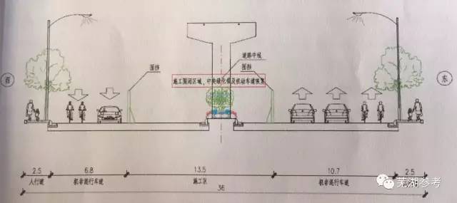在施工期间,将占用13.5m的道路进行围挡施工,届时由原来的双向四车道通行改为双向三车道通行。