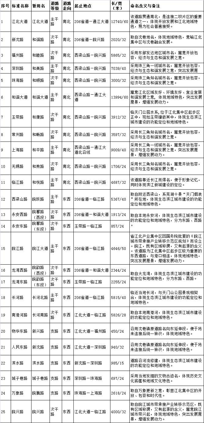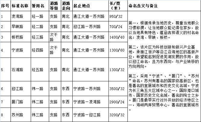 此外,为适应道路所在片区规划功能性特点,此次道路命名还采用寓意深刻且表征性较强、识别度较高的语词命名。如机器人产业园的神舟路、灵鸢路,江北高新产业聚集区内的迎江路,三山峨桥茶市的茶市路、香茗路。