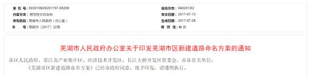 近日,经市政府研究同意,市政府办公室印发了《芜湖市区新建道路命名方案》。共命名市区新建和规划道路119条。小编带你去一探究竟!