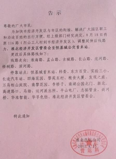 为加快市经济开发区与市区的衔接,解决广大园区职工和沿途百姓的出行方便。经上级部门研究决定,8月18日将原116路(烈山工人村到市经济开发区),调整延伸后线路为,淮北经济开发区管委会至恒基城公交首末站。