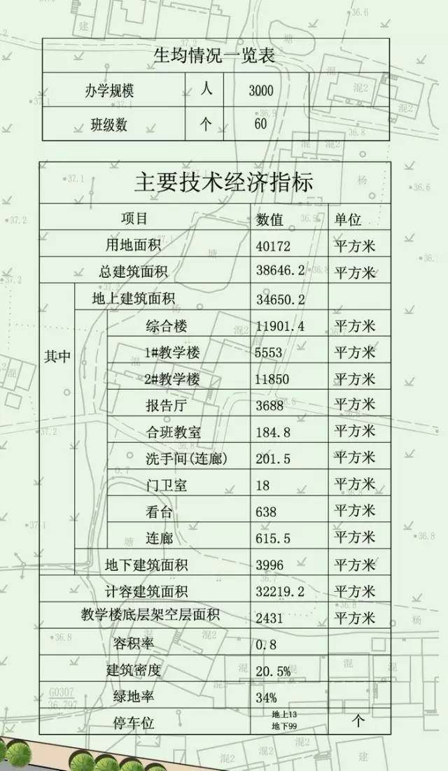 该项目由六安市规划设计研究院设计,净用地面积40172平方米,容积率0.8,建筑密度20.5%,绿地率34%。预计人数3000人,班级60个。