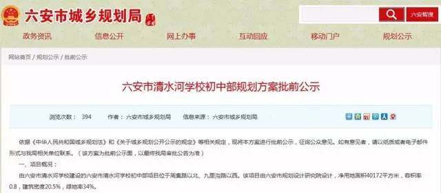 根据六安六安市城乡规划局最新消息, 六安市清水河学校将在城北开建初中部。