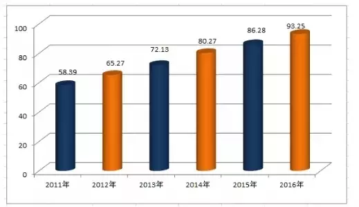 《报告》设定小康经济指数以100为预期点。截至2016年底,全小学康经济指数为93.25,提高6.97,增长8.08%。我国距离全面小康经济发展目标还有6.75的距离。2011年至2016年我小学康经济指数分别为58.39、65.27、72.13、80.27、86.28和93.25,全小学康经济指数连续6年提升。