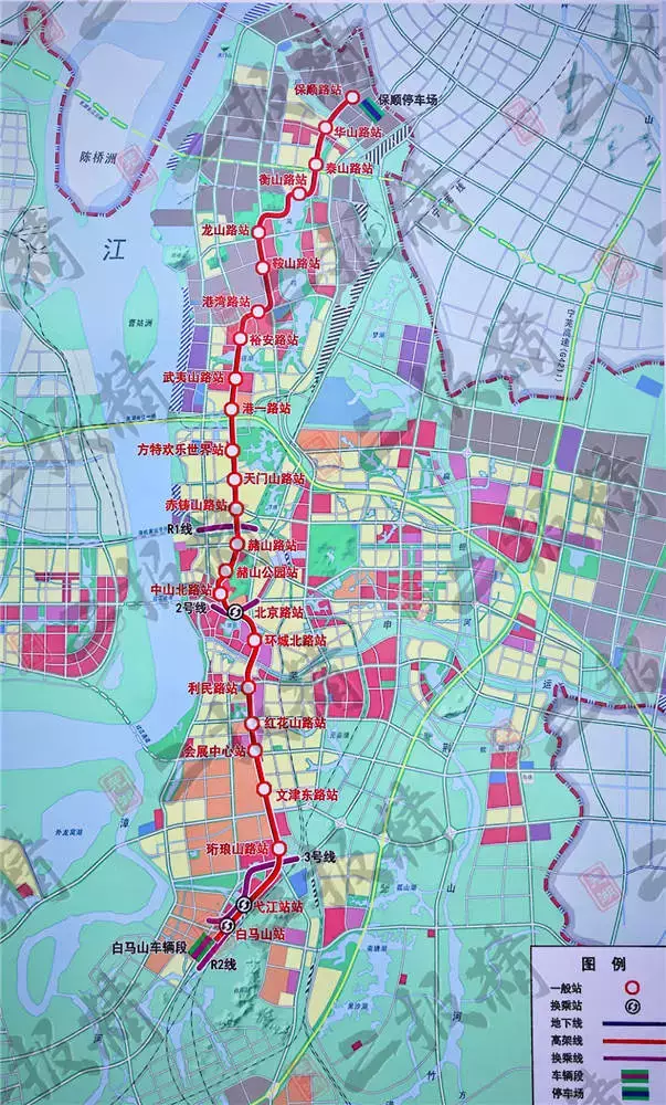 途径车站有:保顺路站、衡山路站、龙山路站、鞍山路站、港湾路站、裕安路站、武夷山路站、港一路站、方特欢乐世界站、天门山路站、赤铸山路站、赭山路站、赭山公园站、中山北路站、北京路站、环城北路站、利民路站、红花山路站、会展中心站、文津东路站、珩琅山路站、弋江站站、白马山路站。