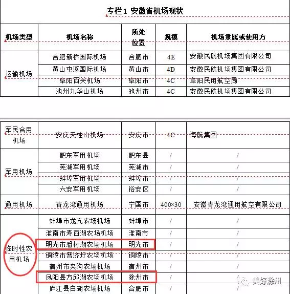 将蚌埠市龙亢农场、明光市潘村湖农场、铜陵市普济圩农场、宿州市夹沟农场、凤阳县方邱湖农场、庐江县白湖农场等临时农用机场纳入A3级通用机场布局,其余农林作业起降点机场按需建设。