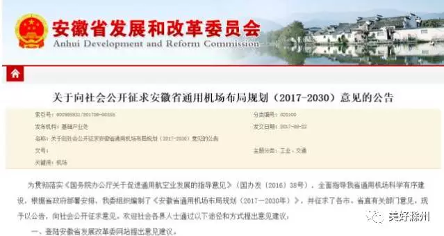 公告中表示,为贯彻落实《国务院办公厅关于促进通用航空业发展的指导意见》(国办发〔2016〕38号),全面指导我省通用机场科学有序建设,根据省政府部署安排,我委组织编制了《安徽省通用机场布局规划(2017—2030年)》,并征求了各市、省直有关部门意见。现予以公告,向社会公开征求意见。