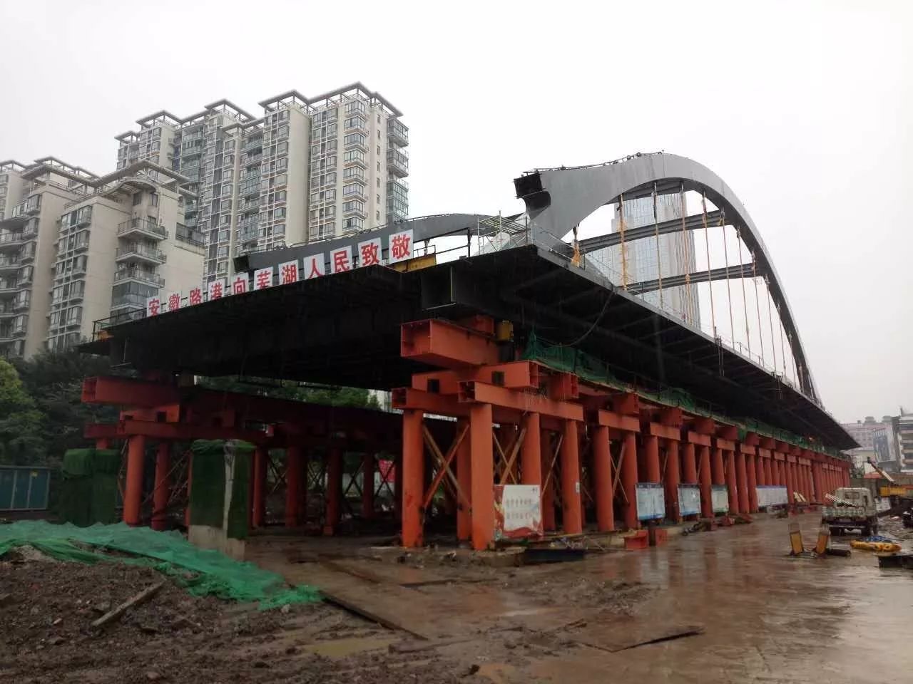 中山桥改建工程,南起浮山路,向北跨越青弋江、北沿河路后与中二街以桥梁形式相接。中二街分别向东西两个方向降坡,于国货路及中和路口落地,中二街桥下预留中山路步行街南北通道。处于城市咽喉地带的中山桥改建工程,可谓难度不小。从城市高空看,中山桥施工场地为梯形。为尽可能减少对周边住户、商户的影响,南岸宽度为35米,北岸最窄处仅26.5米;施工车辆几乎均在傍晚或是深夜“悄悄进场”。