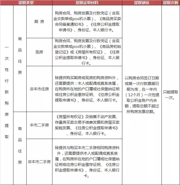 3、一次性付款购买自住住房只能提取一次;
