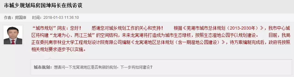 目前,芜湖市城乡规划局正在委托南京林业大学工程规划设计院有限公司编制《龙窝湖地区总体规划(含一期湿地公园建设)》,待方案编制完成后,政府将按照相关规划要求逐步予以实施。