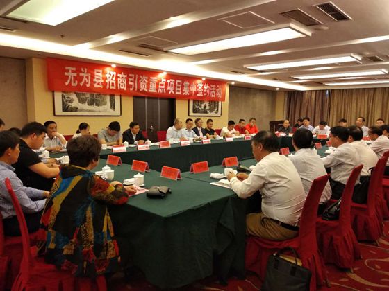 4月28日,无为县举行招商引资项目集中签约活动,现场共签约重大招商项目16个,总投资21.15亿元。其中亿元以上项目10个,5亿元以上项目1个,涉及电气电器、健康食品、羽毛羽绒、现代服务、现代农业等多个产业领域。