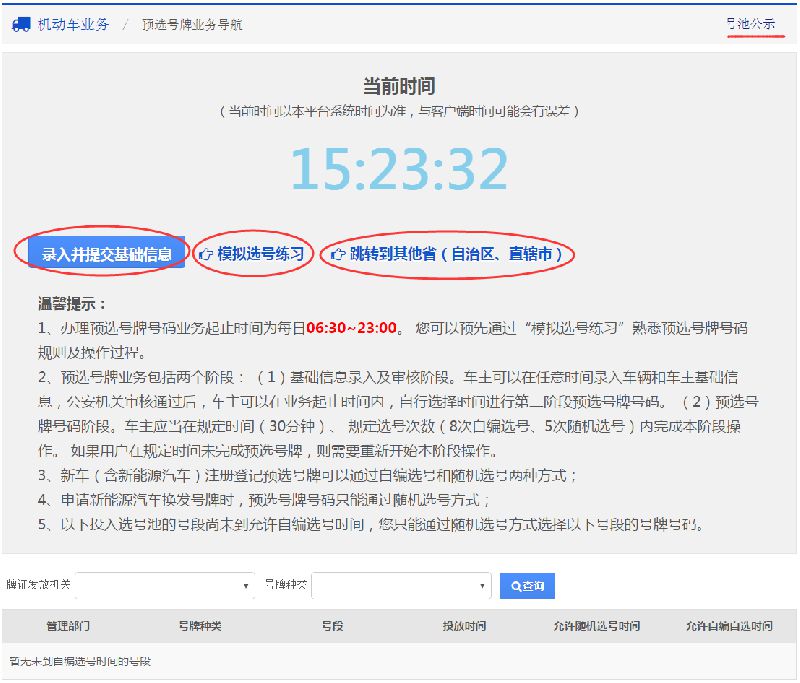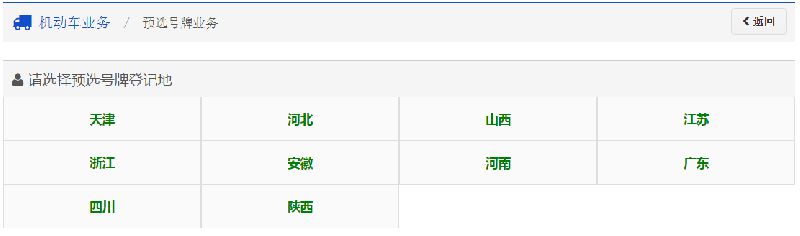 用户根据本人新购小型汽车(或大、小型新能源汽车)需要上牌的车管所选择相应的省市,系统会自动跳转到用户选择的省市互联网服务平台的预选号牌首页。如下图所示: