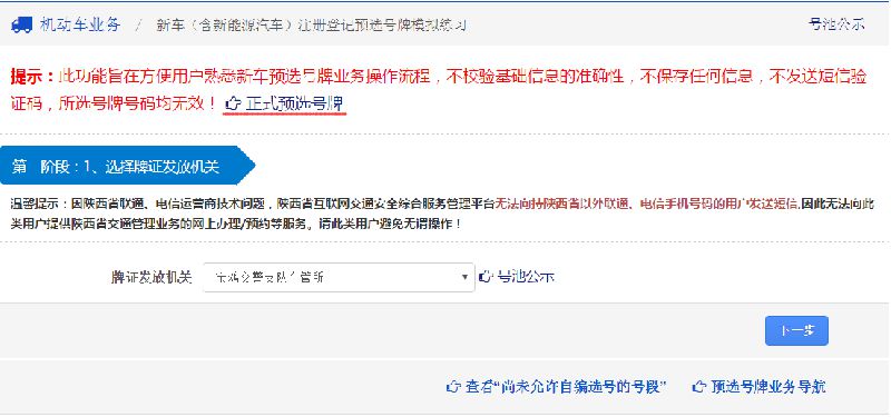 如上图所示,如果用户不熟悉预选机动车号牌业务操作流程,可点击“模拟选号”链接进入模拟选号功能,模拟选号功能与正式选号功能流程完全相同,旨在方便用户熟悉预选机动车号牌业务操作流程,不校验基础信息的准确性,不保存任何信息,所选号牌号码均无效!用户正式预选号牌时,须确保基础信息的准确性! 模拟选号功能界面如下图所示: