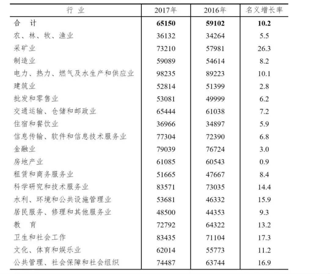 年平均工资居前三位的行业分别是电力热力燃气及水生产和供应业98235元,科学研究和技术服务业83571元,卫生和社会工作83435元,分别是全省平均水平的1.51倍、1.283倍和1.281倍。