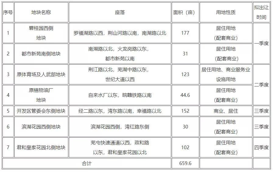 芜湖县2018年度城区经营性用地出让计划项目7宗,土地面积约660亩。其中:2018年第一季度计划招拍挂出让项目2宗,土地面积约208亩;第二季度计划招拍挂出让项目2宗,土地面积约168亩;第三季度计划招拍挂出让项目2宗,土地面积约182亩;第四季度计划招拍挂出让项目1宗,土地面积约102亩。
