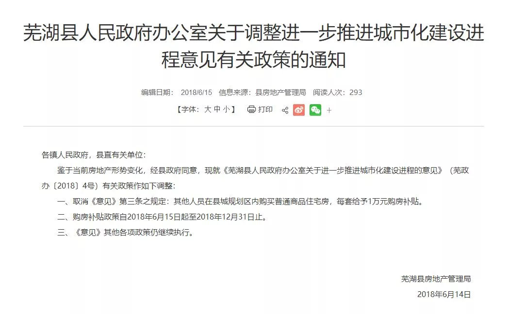 近日,芜湖县政府发布《关于调整进一步推进城市化建设进程意见有关政策的通知》(下称《通知》),根据《通知》,取消其他人员在县城规划区内购买普通商品住宅房,每套给予1万元购房补贴。全文如下: