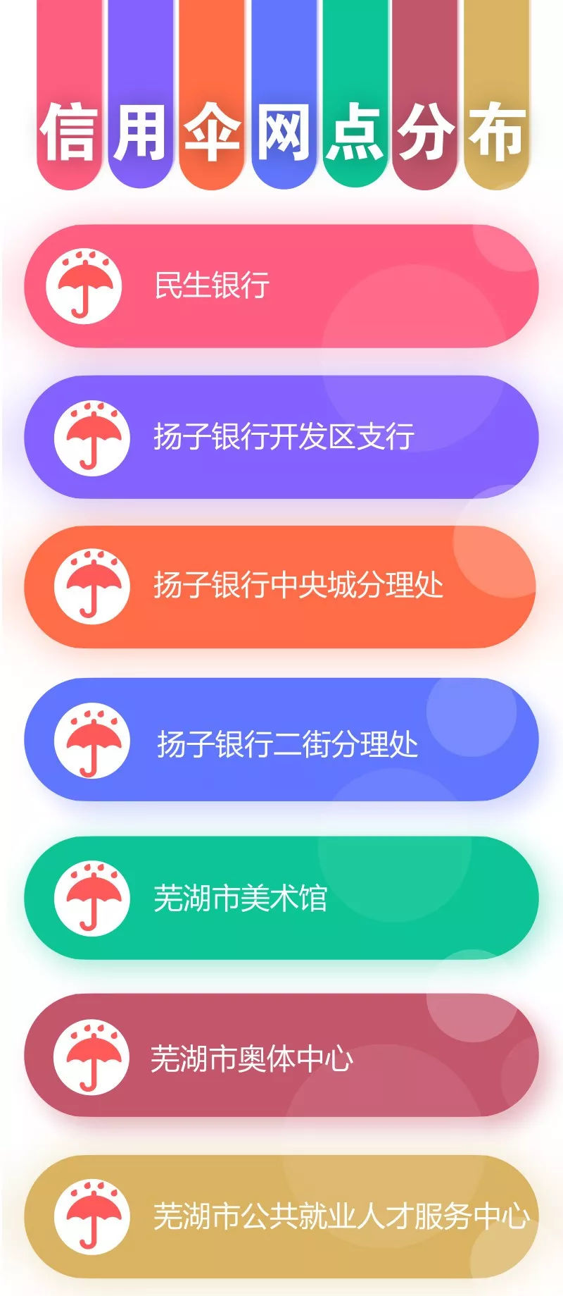 目前芜湖已经有了10个信用晴雨伞借还网点,这些网点主要分布在银行、公共场馆、市民服务中心等地点,具体分布点如下,大家可以看看是否就在你的身边哦!