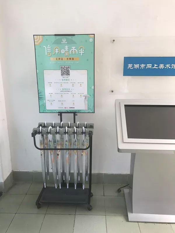 位于芜湖地区的信用晴雨伞借还网点,每个网点的借还设备都配备了12把雨伞。