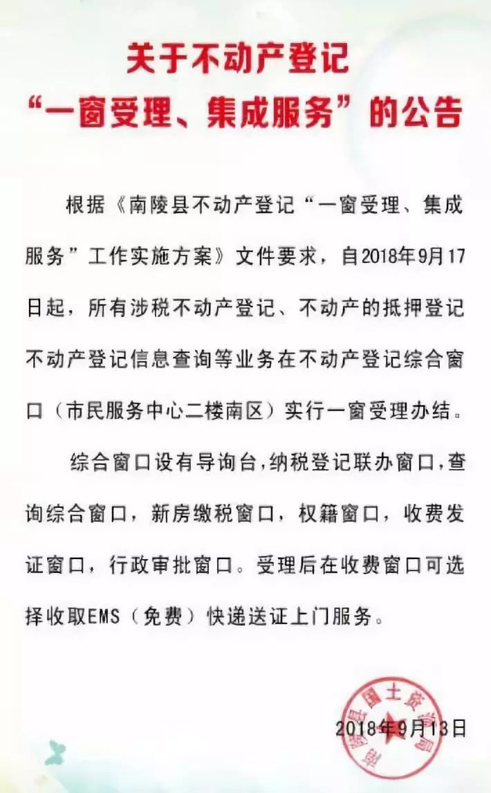 根据《南陵县不动产登记“一窗受理、集成服务”工作实施方案》文件要求,自2018年9月17日起,所有涉税不动产登记、不动产的抵押登记、不动产登记信息查询等业务在不动产登记综合窗口(市民服务中心二楼南区)实行一窗受理办结。
