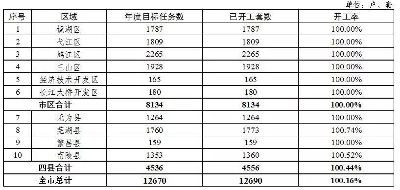 芜湖市区年度目标任务数8134户,已开工数8134户;