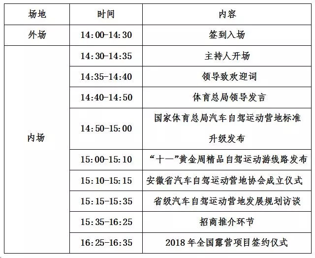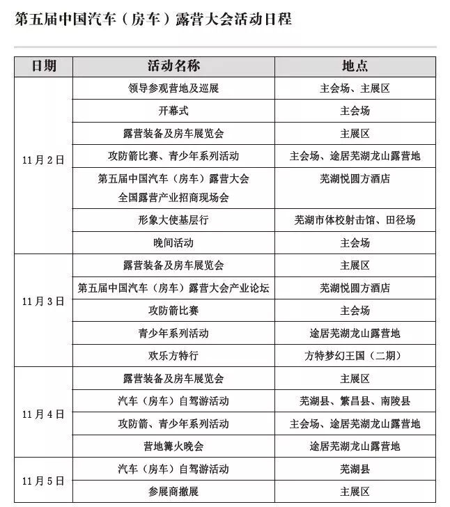 赛会重点推出极具芜湖特色的大会开幕式、汽车(房车)及露营装备展览会、星级营地展示 、全国露营产业招商现场会、201 8全国汽车自驾营地攻防箭大赛、芜湖景区房车自驾游、奥运冠军体育明星基层行和青少年笼式足球、车辆模型比赛等系列活动。