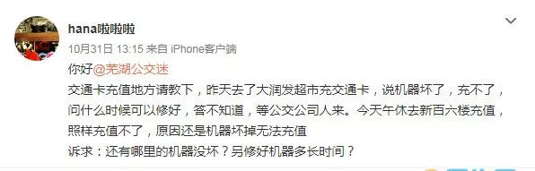 经向IC卡中心了解,新百大厦充值点因卡纸报修,未收到大润发充值点报修的申请,可能是充值点的私自停止服务行为。