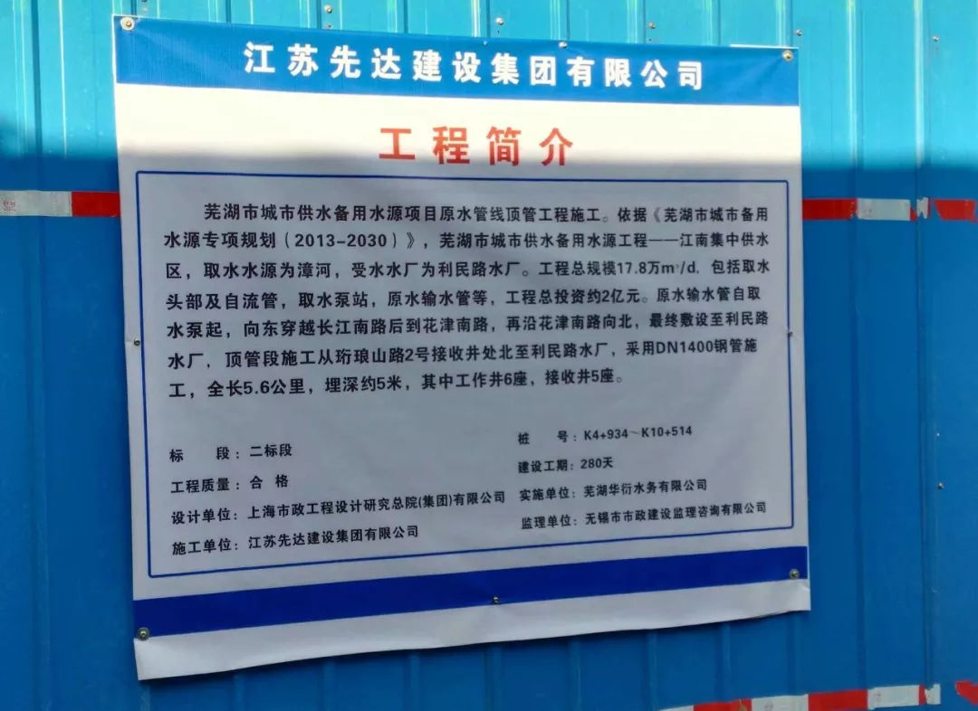 芜湖市城市供水备用水源工程——江南集中供水区,取水水源为漳河,受水水厂为利民路水厂。工程总规模17.8万立方米/d,包括取水头部及自流管,取水泵站,原水输水管等,工程总投资约2亿元。原水输水管自取水泵起,向东穿越长江南路后到花津南路,再沿花津南路向北,最终敷设至利民路水厂,顶管段施工从珩琅山路2号接收井处北至利民路水厂,采用DN1400钢管施工,全长5.6公里,埋深约5米,其中工作井6座,接收井5座。
