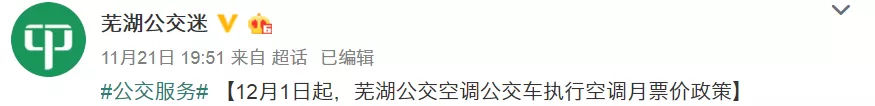 公交车是许多芜湖人首选的公共交通工具,公交票价的变化也是大家密切关注的事情。12月1日起,芜湖公交票价将调整啦!根据市物价局《关于芜湖市空调公交车实行季节性优惠票价的通知》及(芜价价[2013]190号)文件精神公交集团决定自2018年12月1日至2019年2月28日公交车执行空调月票价政策